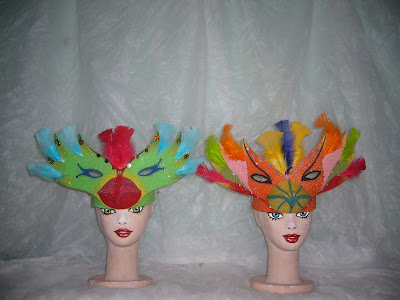 Tocado arlequin en goma espuma fuccia, verde y blanco con plumones amarillos y cascabeles
